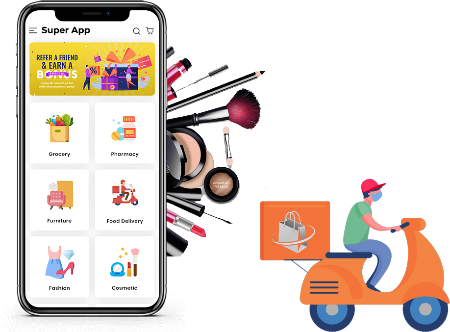 Superapp is built to provide easy access to Groceries, Medicines, Furniture, Food, Clothes, and Comestics all inside one app. This app gives users the freedom to purchase goods & services Anytime, Anywhere, with fast shipping.